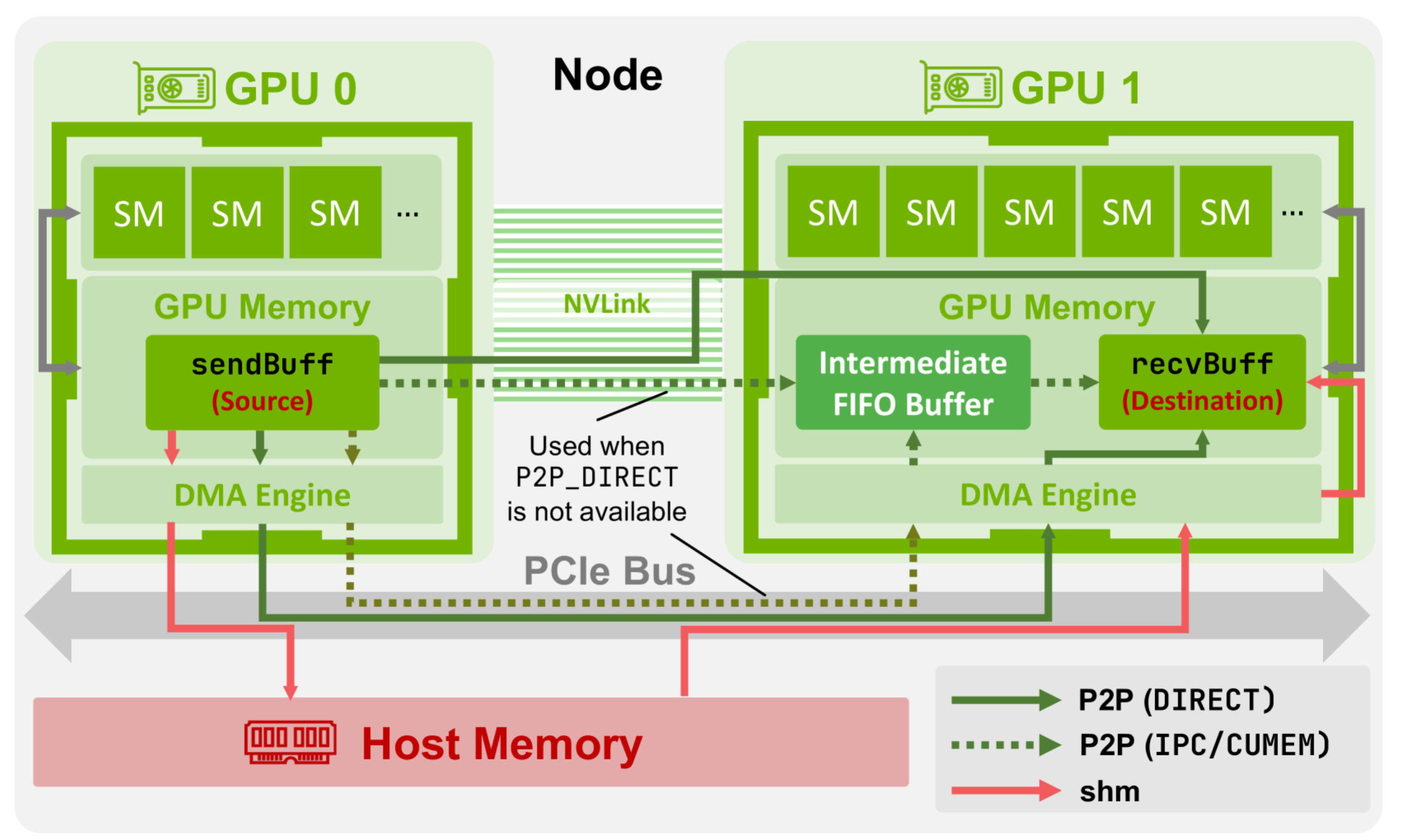 How GPUs on the same node communicate with each other.