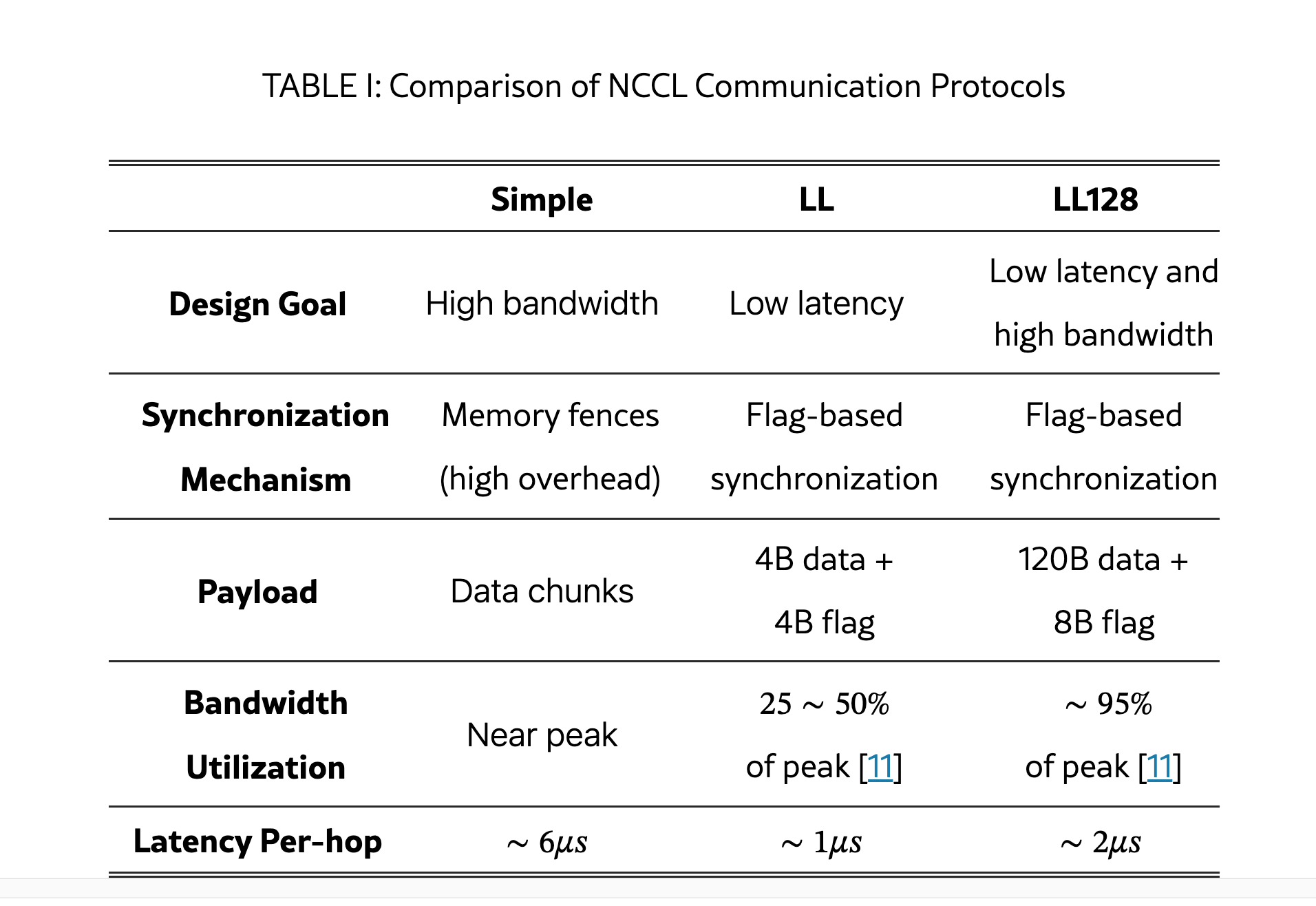 LL128: Uses 128-byte aligned atomic writes to strike a balance between latency and bandwidth (can reach up to 95% max bandwidth). Requires specialized hardware over NVlink.