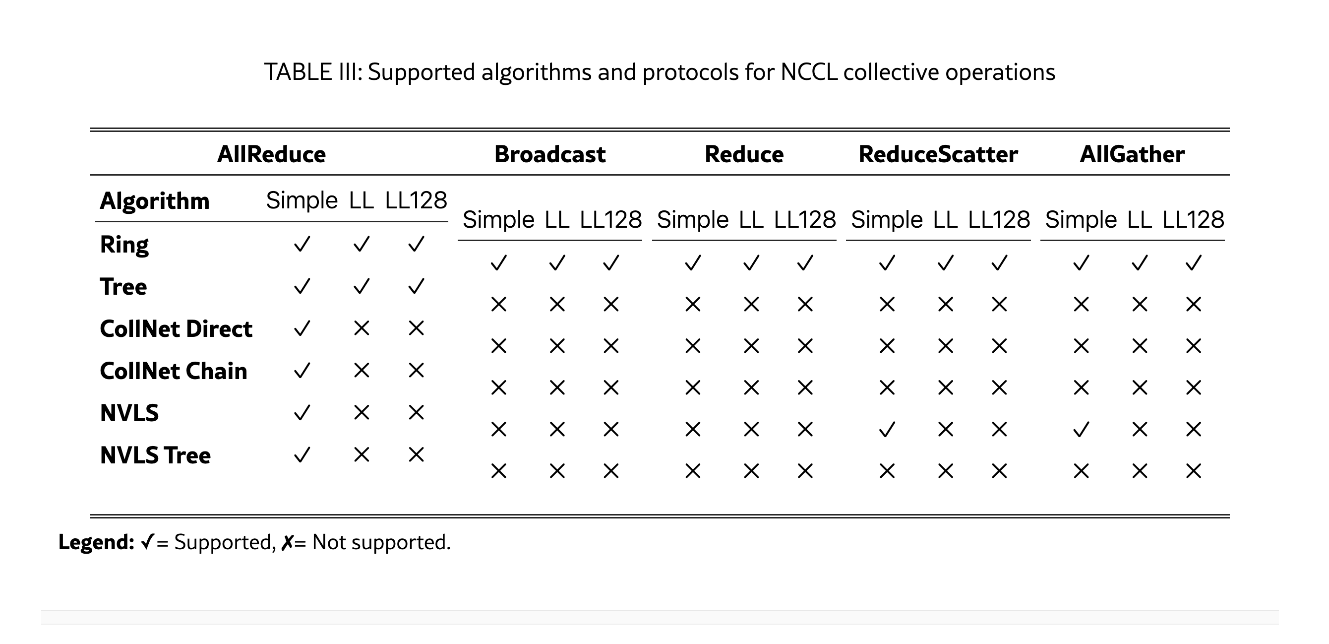 NCCL supports 5 collective operations (AllReduce, Broadcast, Reduce, AllGather, ReduceScatter) and two point-to-point operations (Send, Recv).