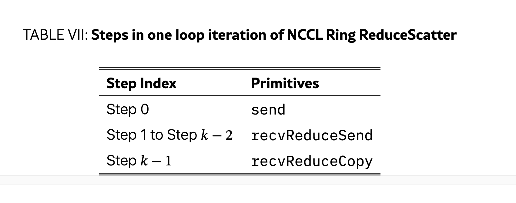 - AllGather: Each GPU then forwards its segment to all others. This algorithm requires 2(k–1) steps for k GPUs. Each channel executes a sequence of pipelined steps (like recvReduceSend or recvCopySend) within its buffer slots, intelligently overlapping network and compute operations.