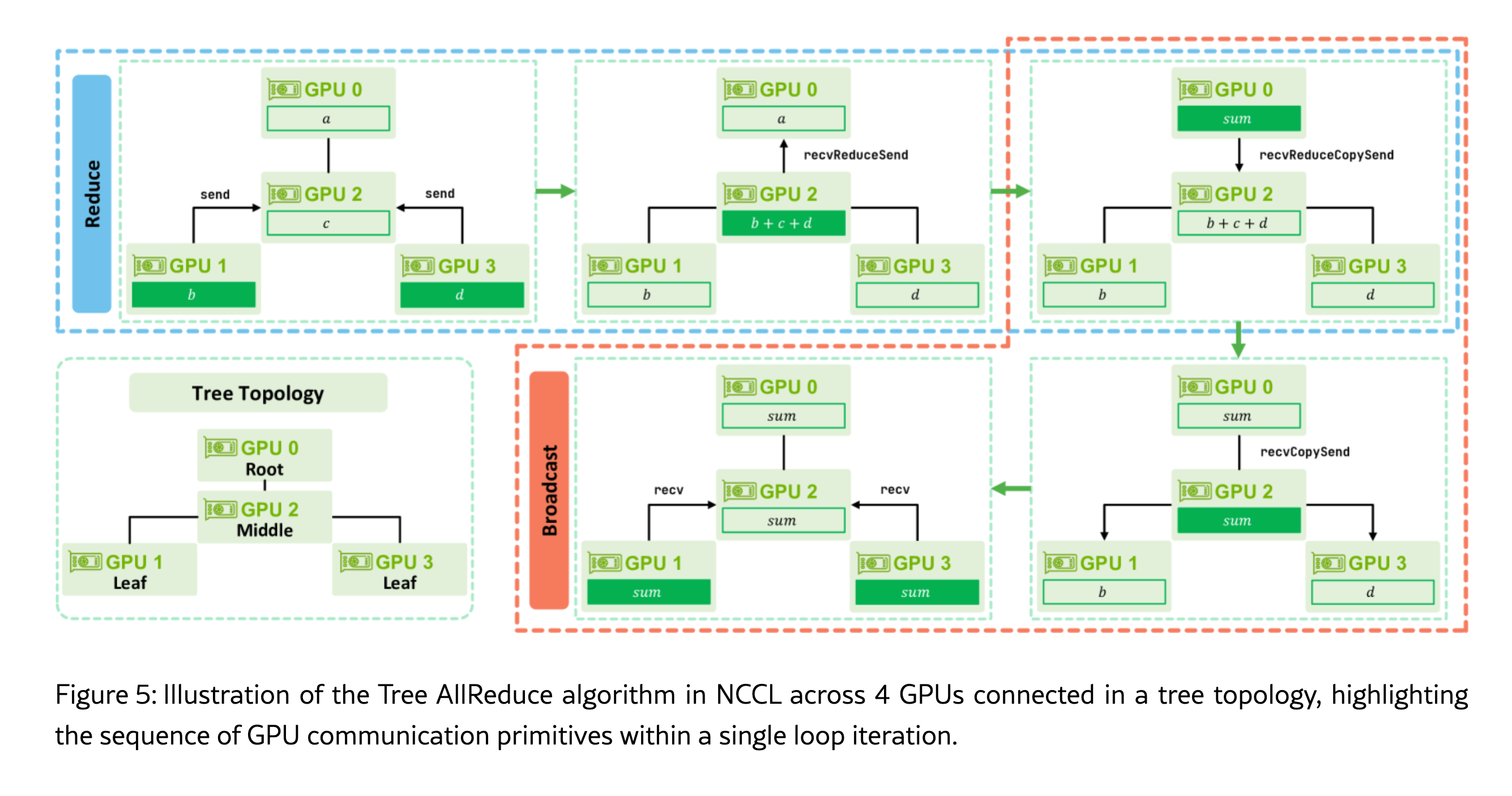 - Broadcast Phase (Distribution Down): The fully aggregated result is then sent back down the tree. The Root sends the result to its children, and Middle GPUs continuously relay the result while saving a copy locally, using the primitive. Finally, the Leaf GPUs receive the final data (). For efficiency, these two phases can execute concurrently by dedicating more resources to the reduction step.