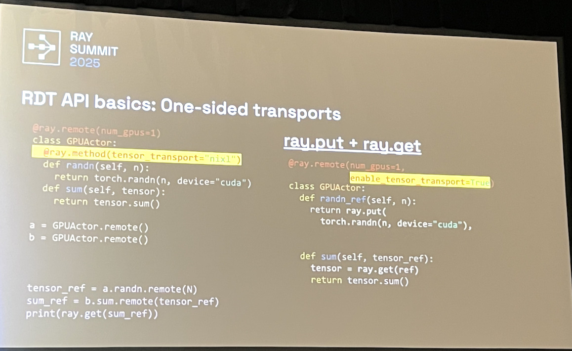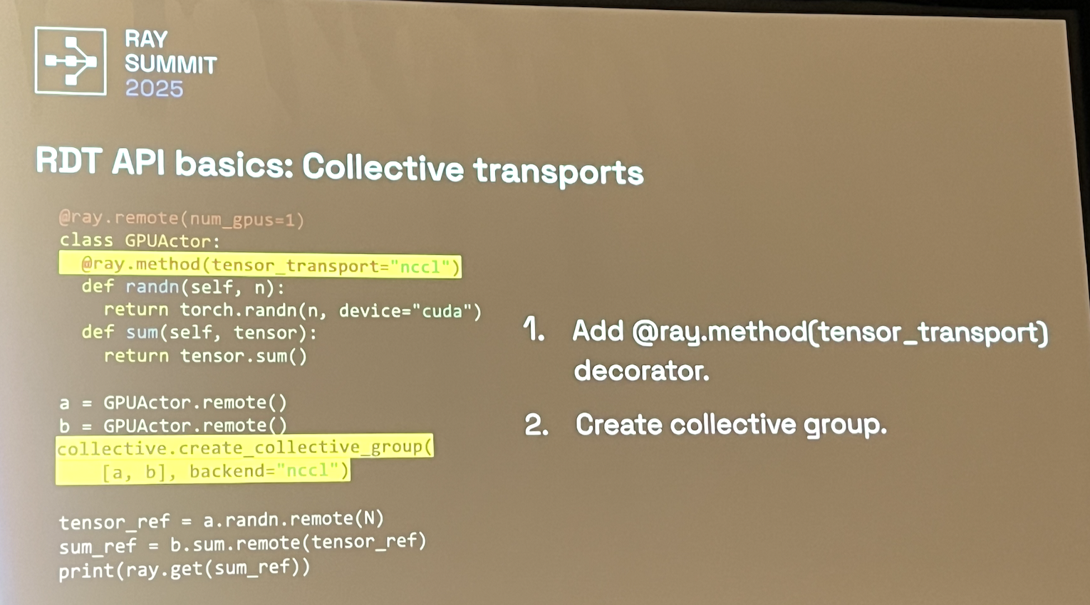 - Can either do collective (NCCL) transports or point-to-point (NIXL) via ray.put+ray.get