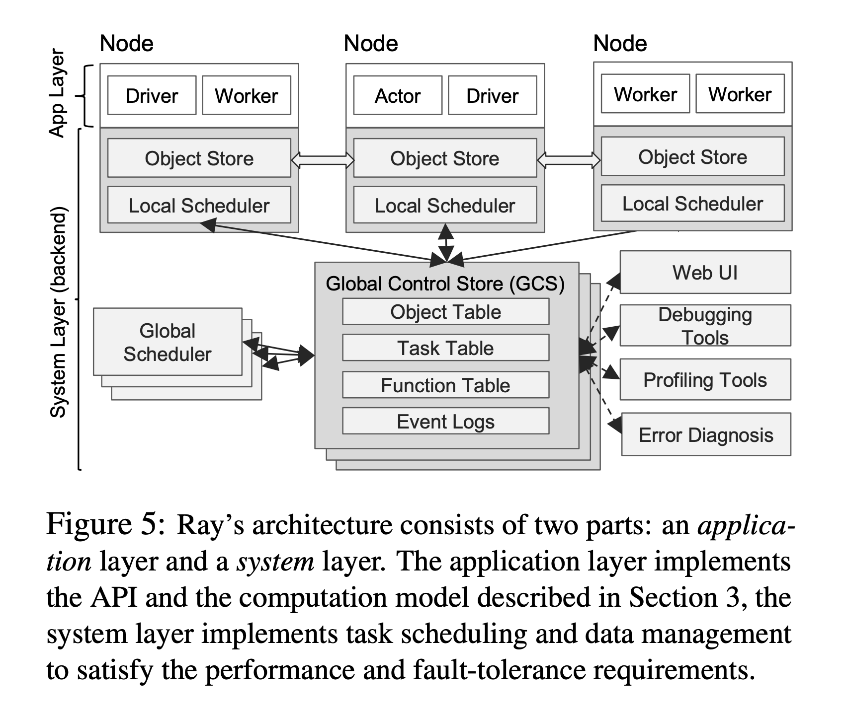 In contrast with SDNs, BOOM, and GFS, Ray decouples the storage of the control plane information (e.g., GCS) from the logic implementation (e.g., schedulers). This allows both storage and computation layers to scale independently, which is key to achieving our scalability targets.