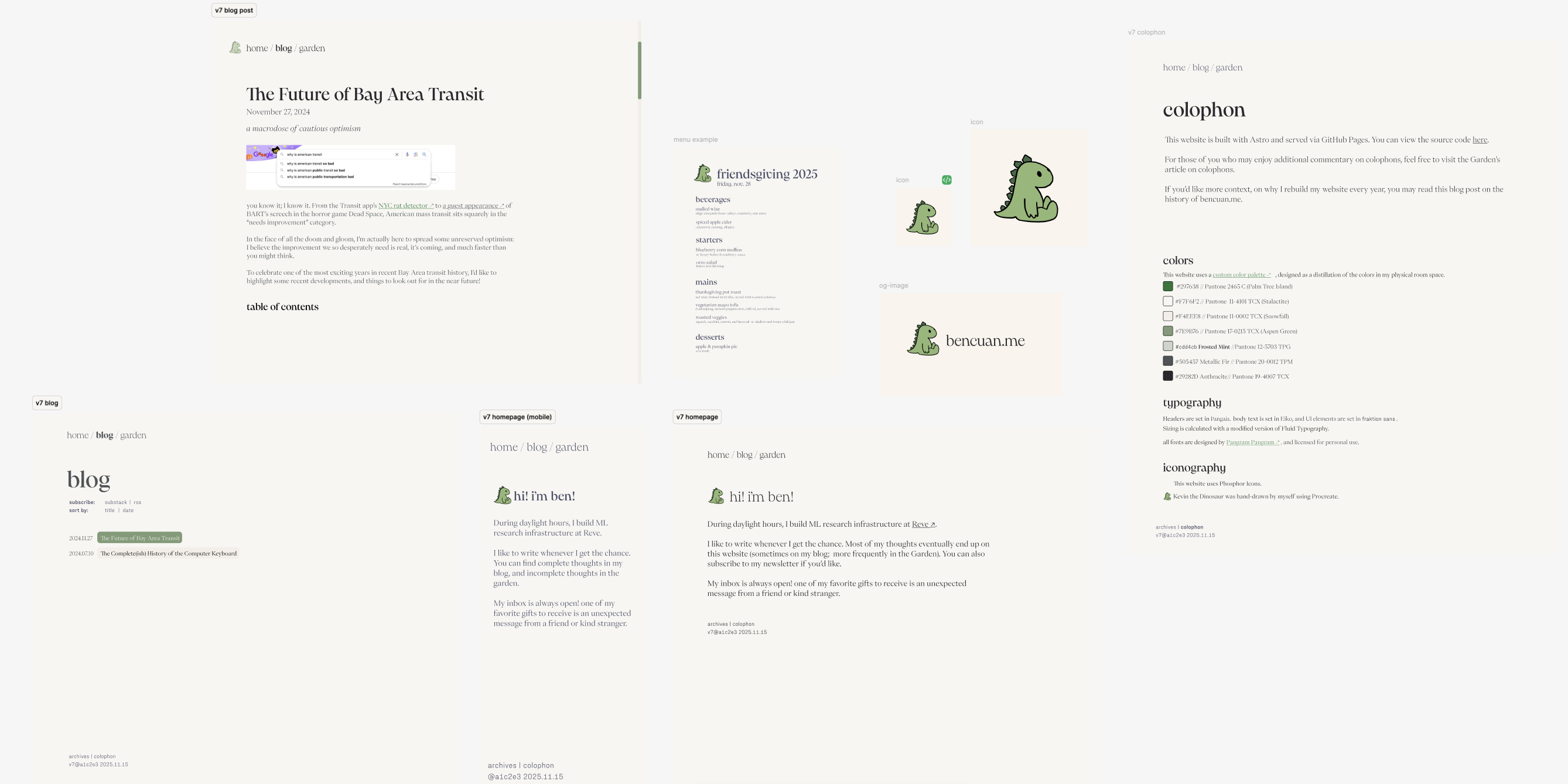 The existence of the Garden, which I launched earlier in 2025, drove most of the high-level design decisions for my main website. Now that I have a space dedicated to chaos and playful experimentation, I could reserve bencuan.me to become my curated, organized, forward-facing side on the internet.