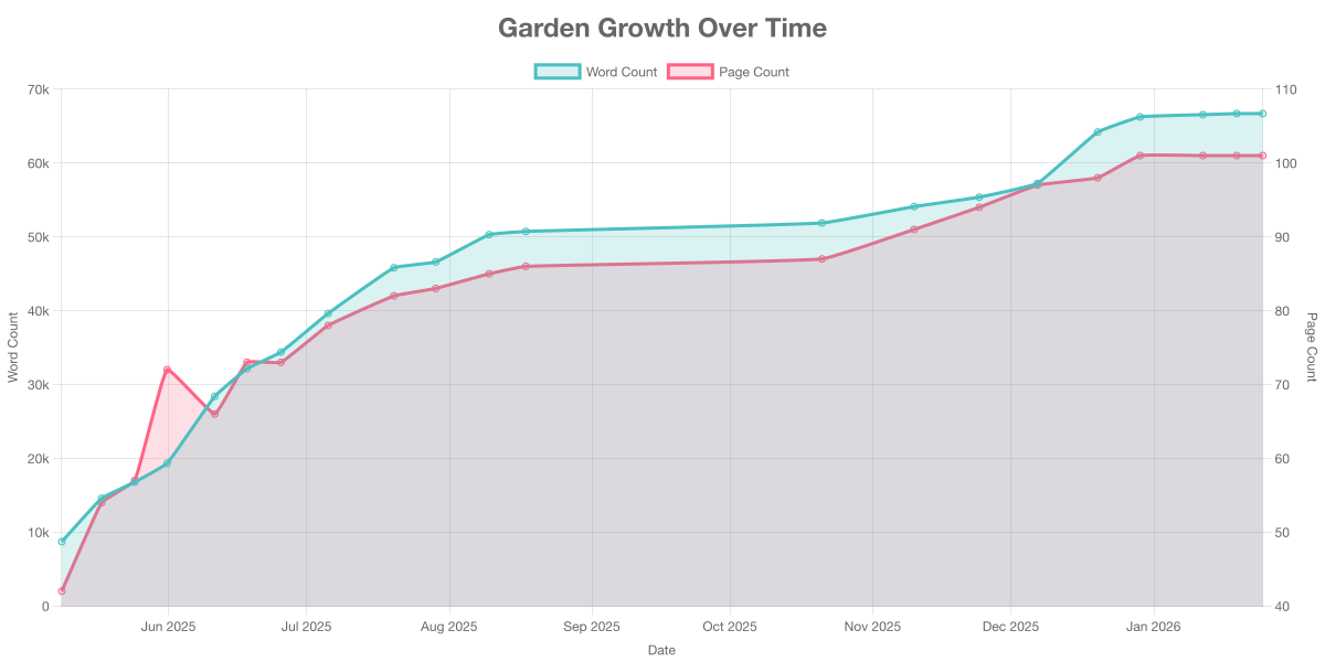 Tending to the Garden has provided me with a good, needed break from formal blog-post writing for the past six months. I now have over 65,000 words across 100 published pages:
